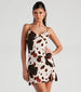 Show off your trendy style in this adorable cow print slip dress! It features a sleeveless V-neckline. bungee spaghetti straps. a stylish small front slit. and a short fitted silhouette. Complete the look with ankle booties.