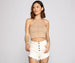 Elevate your basic everyday summer look with this trendy crop top. It features a sleeveless halter neckline with a tie closure at the back of the neck. merrow edge seam and trim detailing. and a cropped. form-hugging fit. Style this knit top with cutoff denim shorts and chic shades.