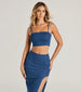 You and this denim crop top will be a trendy match! This denim top features a flattering square neckline. spaghetti straps. and a fitted crop hem that flaunts your figure. Complete the look with the matching skirt.