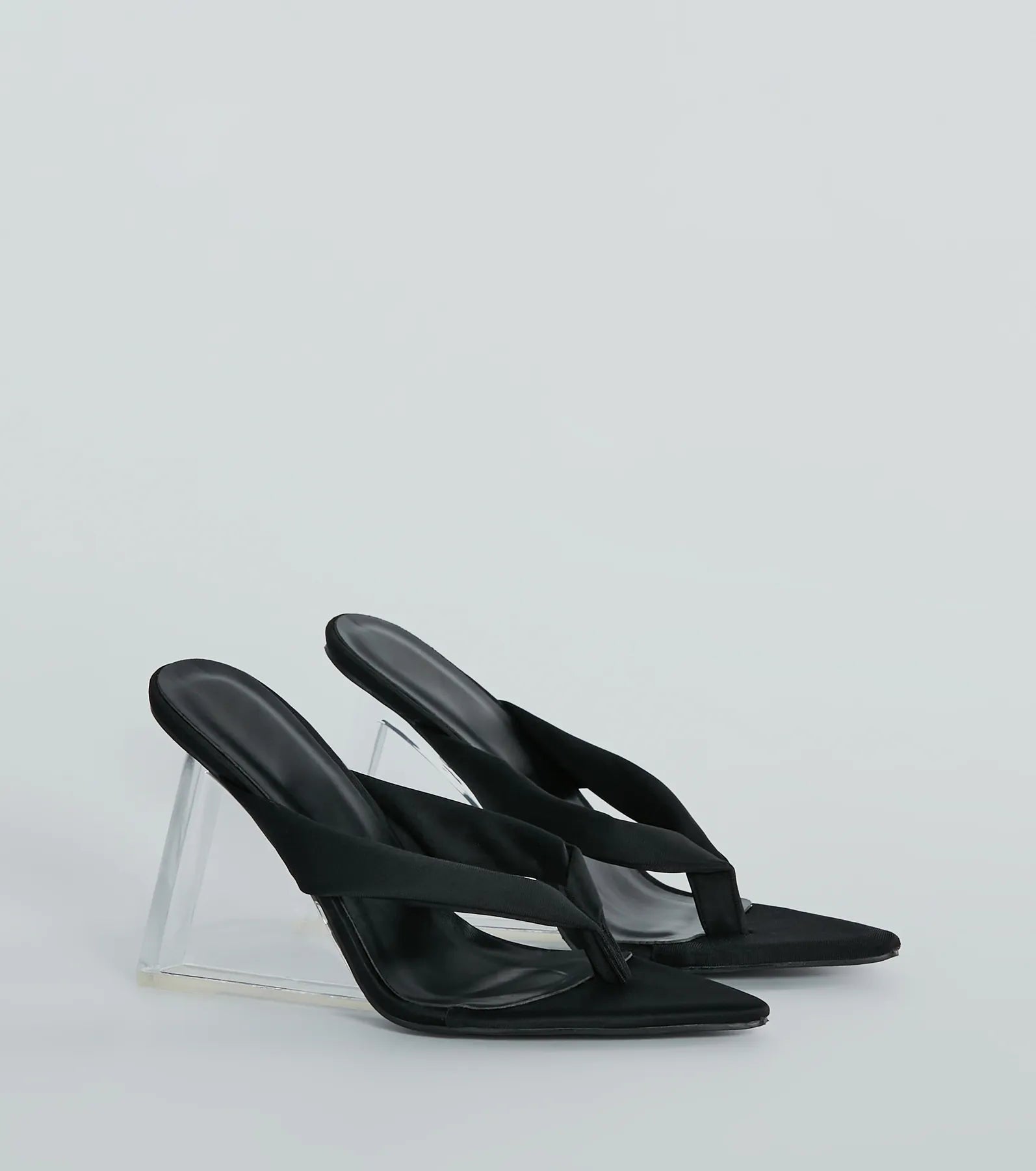 Turn on trendy mode with these fab thong strap clear wedges! They feature a clear wedge cutout heel. an open pointed toe for that sleek look. a lycra thong strap design. and an open back for effortless on-and-off styling. Pair these heels with hoop earrings and a chic handbag!