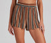 Keep it trendy with shorts that are all the rage! The shorts feature a trendy striped pattern. a high-rise waist. and a cheeky bottom. Complete the look with the matching tube top.