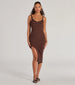 This trendy ribbed knit midi dress features a sleeveless V-neckline. spaghetti straps. and a high-cut front slit on the form-hugging silhouette. Perfect for pairing with hoop earrings and flats.