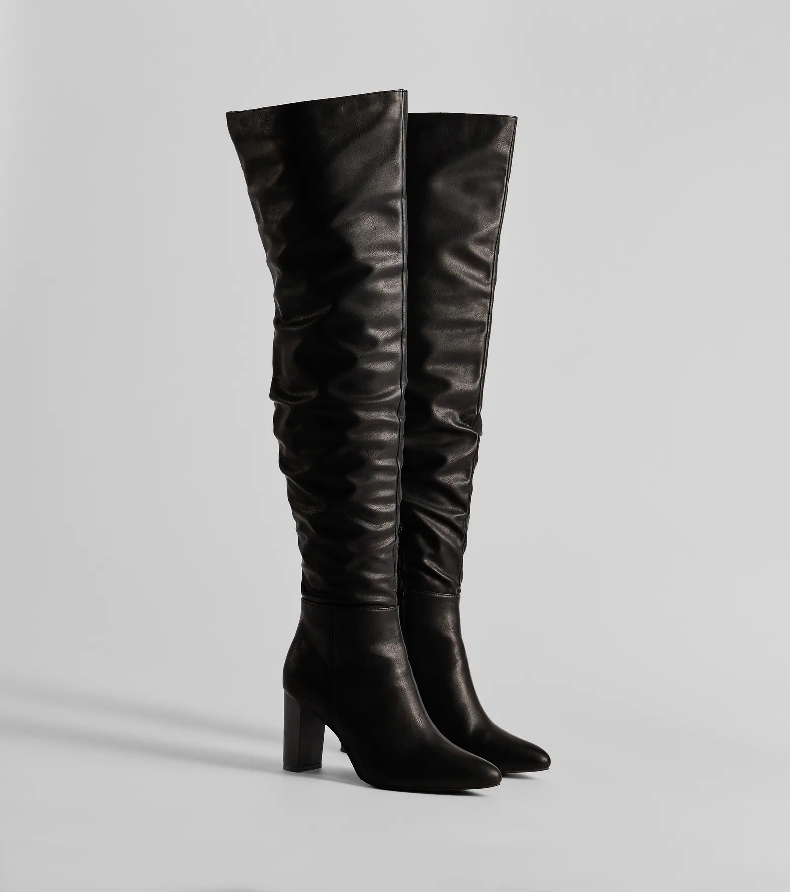 Make every strut trendy in these faux leather over-the-knee boots featured in a scrunched design with a comfortable block heel. Pair with a trench coat.