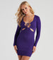 Show off a fab trendy style in this long sleeve sweater dress! It features a scoop neckline. a bold cutout at the bust with a tie-front design. dual front cutouts at the waist. and a short. curve-hugging silhouette. The knit fabric offers a moderate stretch. Pair with knee-high boots for a cute everyday 'fit.