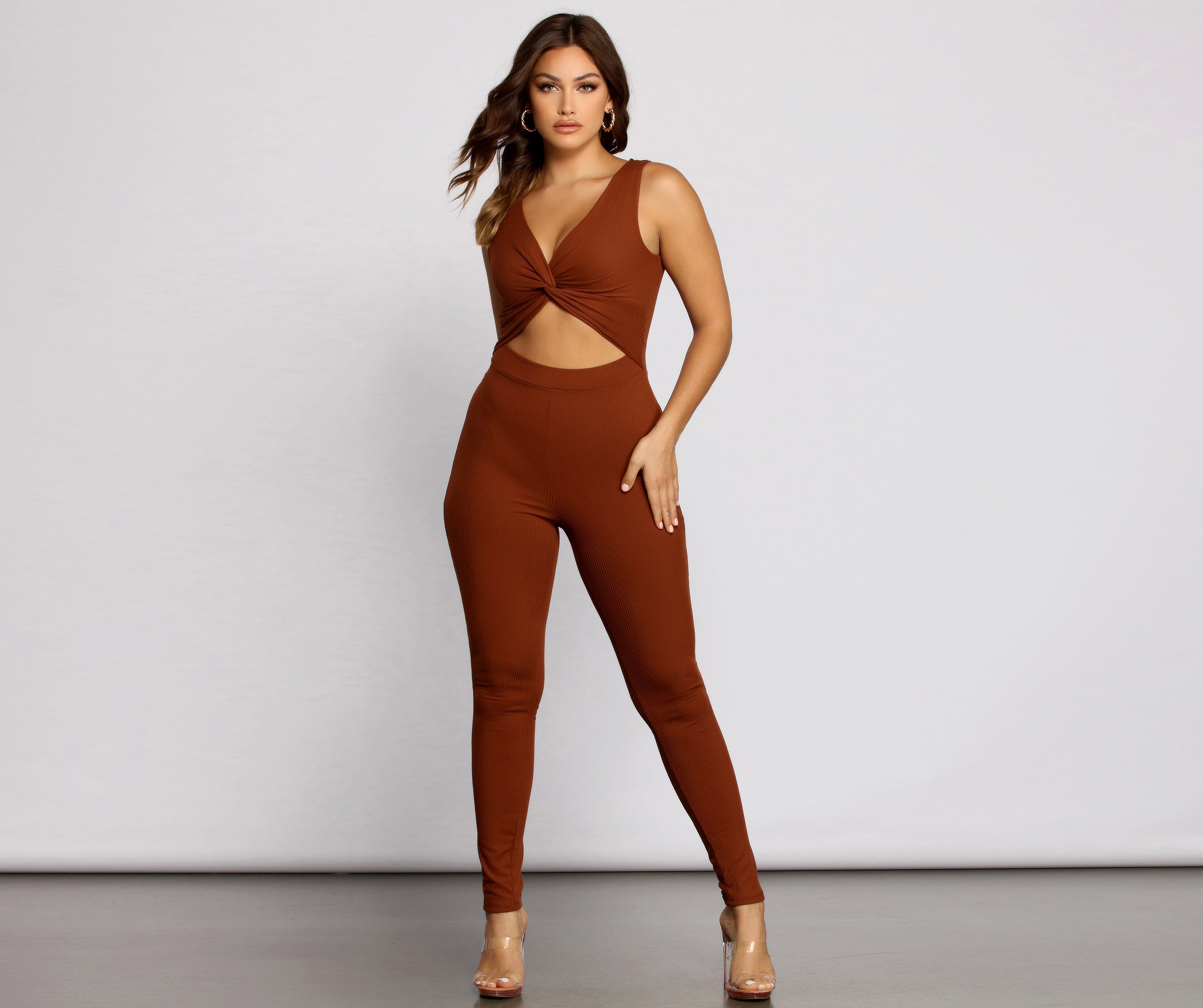 Give your catsuits a fab twist to glam them up for a night out with the squad! The catsuit features a sleeveless bodice. a plunging V-neckline with a twist-knot accent. and a sexy midriff cutout. The relaxed fit bodice leads to a form hugging skinny leg with a tapered hem. The jumpsuit is composed of a ribbed knit fabric that offers a form hugging fit with a moderate stretch. Complete look with clear heels.Â