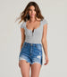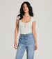 Elevate your casual 'fit with the trendy vibe of this form-hugging bodysuit! Made with a stretchy double-lined ribbed knit fabric. it features a scoop neckline. short sleeves. a partial hook and eye front design. and a cheeky bottom with a dual snap button closure for effortless styling. Pair with high-rise jeans.