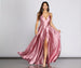Dance under the spotlight in our Trinity! She features a v neckline. double spaghetti straps that cross over to a low back. and a fitted bodice with a wrap design. Bodice meets skirt high waist with a banded detail. and flows into an overlapping a line design. Dress includes pockets and is composed of a satin material that offers slight stretch. Zipper located low back.