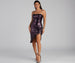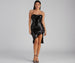Make a sparkling impression with the Trista formal midi dress that captures that glow just right! Trista features a sleeveless square neckline. bungee spaghetti straps. padded cups for a supportive fit. a fitted bodice leading to a mid-length silhouette with a ruffled side slit. and all-over dazzling sequin embroidery. The dress is composed of a lined mesh fabric that offers a curve-hugging fit with minimal stretch. Complete the look with rhinestone heels.