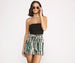 Escape to the topics in a romper that brings those vacay vibes girl! The romper features a sleeveless square-neck bodice. paper bag shorts with a tie waist belt. and a tropical palm-leaf print with stripes. Complete outfit with wedges and sunglasses for your vacay-approved look.Â