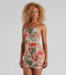 Keep it glam on your tropical getaway with a mini dress that brings those island vibes! The dress features a tropical floral print. a sleeveless square neckline. spaghetti straps. ruching. and a short length with a rounded hem. The dress is composed of a lined smooth knit fabric that offers a form hugging fit with a moderate stretch. Complete look with sandals and a straw hat.
