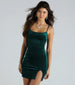 Twinkle like a star at night in this enchanting velvet mini dress at a Vegas club or bachelorette! It Features a sleeveless scoop neckline. spaghetti straps. a sexy bodycon silhouette. and a flirty hem slit. The dress is composed of a glitter velvet knit fabric with a moderate stretch. Complete the look in chunky platform heels.