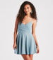Get ready to glow with a skater dress that brings major bling to your look! The short dress features a sleeveless V-neckline. spaghetti straps. draped overlay at the bodice. and a fit-and-flare skater silhouette with subtle pleating. The dress is composed of glitter knit fabric that offers a moderate stretch. Complete the look with rhinestone heels and a glitter mesh clutch.