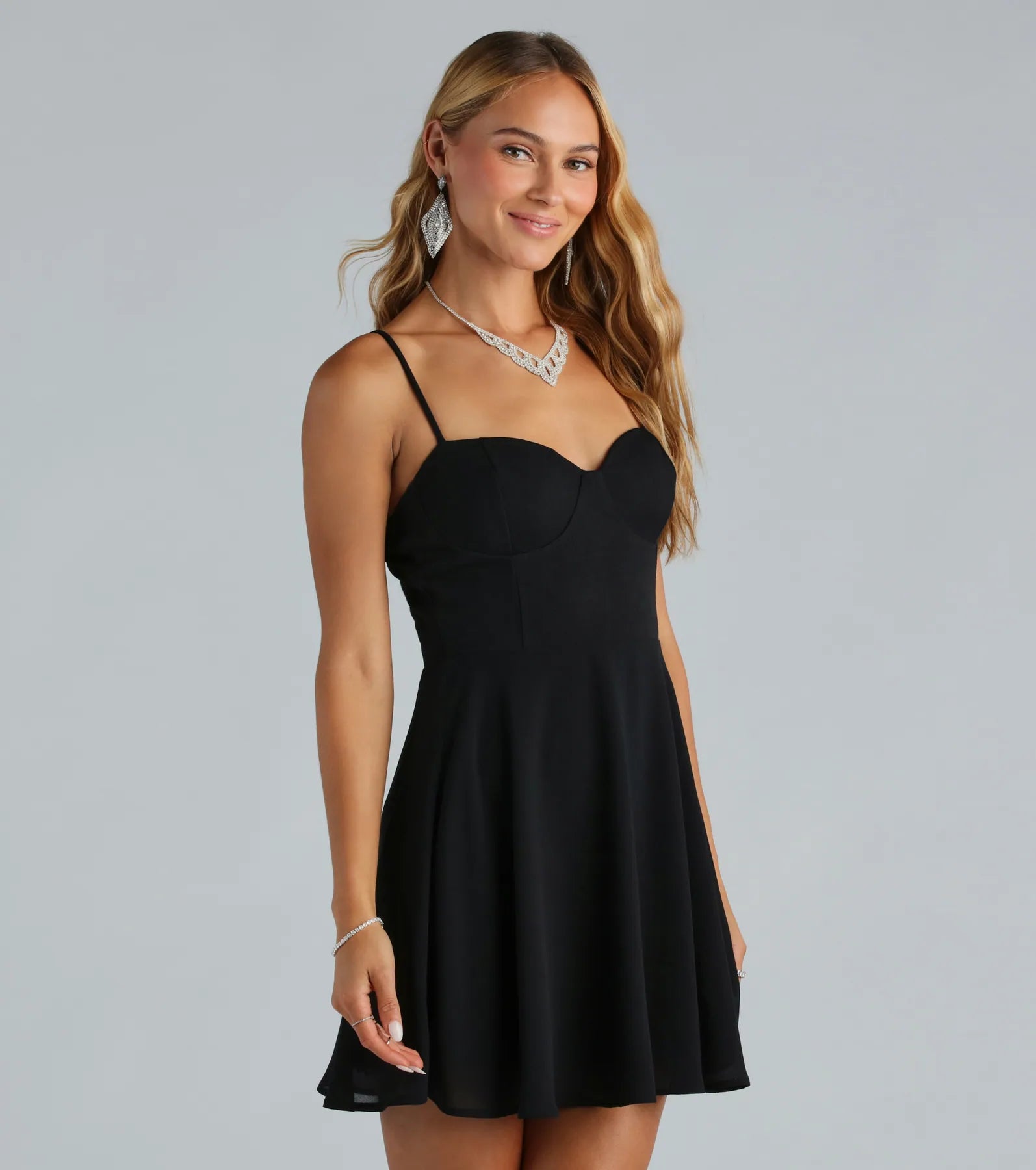 Twirling tonight is inevitable when wearing this crepe skater dress! It features a crepe bodice. sweetheart neckline. spaghetti straps. a padded bust. and a chiffon short-length hem. Complete the look with a rhinestone choker and heels for a party or school dance!