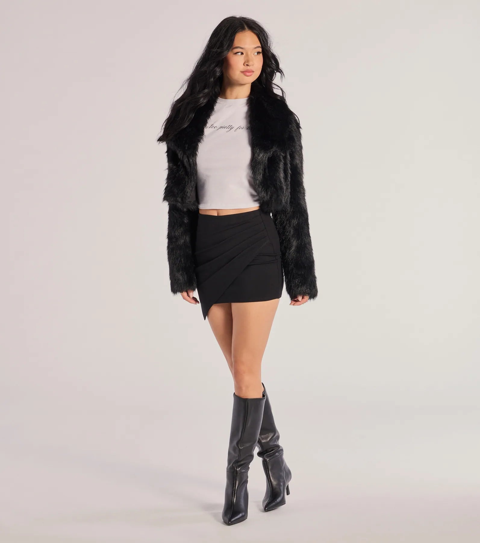 Flaunt your style in this wrap mini skirt. With its pleated wrap design and comfy knit fabric. this skirt is perfect for any adventure.