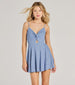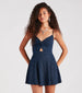 The glitter knit skater romper features a sleeveless V-neckline with a trendy twist-front design followed by a stylish keyhole cutout. The flowy skirt overlay keeps the shorts lining hidden. and showcases an adorable fit-and-flare silhouette. Complete your glitzy look for a dance with metallic heels.