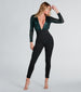 Take a daring plunge in this sequin jumpsuit for the ultimate shine! Embellished with shimmering sequins. it features a deep V-neckline. back keyhole cutout with button closure. fitted long sleeves. and crepe skinny-leg bottoms with pleating down the front. Complete the look in sleek pumps for a birthday bash or cocktail party!