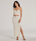 A lace maxi skirt featuring a high-rise waist with a bow. side slit. and a form-hugging fit. The lace-lined fabric offers a romantic feel and stretch.