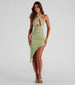 Take your style up a notch and flaunt your flirty side in this halter midi dress featuring a sleeveless bodice. cross straps. a front keyhole cutout. side ruched seams. and a curve-hugging asymmetrical hem. Complete the look in fringe earrings for a dressy night out.