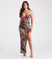 Activate vacation mode with this sultry tropical print maxi dress! It features a sleeveless V-neckline. spaghetti straps that lead to a cross-back design. ruching down the side seam leading to an alluring thigh-high slit. an asymmetric maxi-length hem. and a bodycon silhouette that will hug your curves. The stretchy knit fabric features an all-over bold tropical palm leaf pattern. Style with strappy sandals.