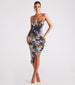 Slay your vacay look with this curve-hugging tropical print midi dress! It features a sleeveless V-neckline. spaghetti straps. a ruched side seam. a midi-length asymmetric hem creating a chic side slit. and a bodycon silhouette. The all-over tropical palm leaf print will really bring those vacay vibes. Complete the look with clear mules.