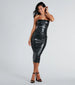 This sleek faux leather midi dress will bring the vampy vibes to your going-out look. It features a strapless straight-across neckline. ruching at the waist. a midi-length hem with a chic back slit accent. and a bodycon silhouette to flaunt your figure. The faux leather fabric offers a moderate stretch. Style this midi dress with lace-up stilettos for an edgy night-out 'fit.