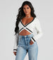 Can't decide what to wear? Let this varsity crop sweater slide into your lineup! It features long sleeves with striped cuffs. a v-neckline. and a high-low hem on cable knit fabric with minimal stretch. Complete the look in skinny jeans and boots.