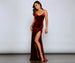 Mesmerize in a formal dress that brings the luxe to your evening! Vega features a sleeveless V-neckline. padded cups. bungee spaghetti straps that cross at the back. bungee bar straps. a high side slit. and an A-line silhouette. The dress is composed of a lined velvet fabric that offers a form-hugging fit with a moderate stretch. Complete look with rhinestone heels and a clutch.Â