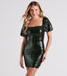 A girl like you deserves to shine! Make the room sparkle in the Vera sequin dress at formal dances. birthdays. and dressy date nights. She features adorable short puff sleeves with elastic cuffs. a square neckline. and a short. bodycon silhouette. The formal party dress is composed of a sequin-knit mesh fabric with a stretchy knit lining. Style with an envelope clutch and heels to complete the look!