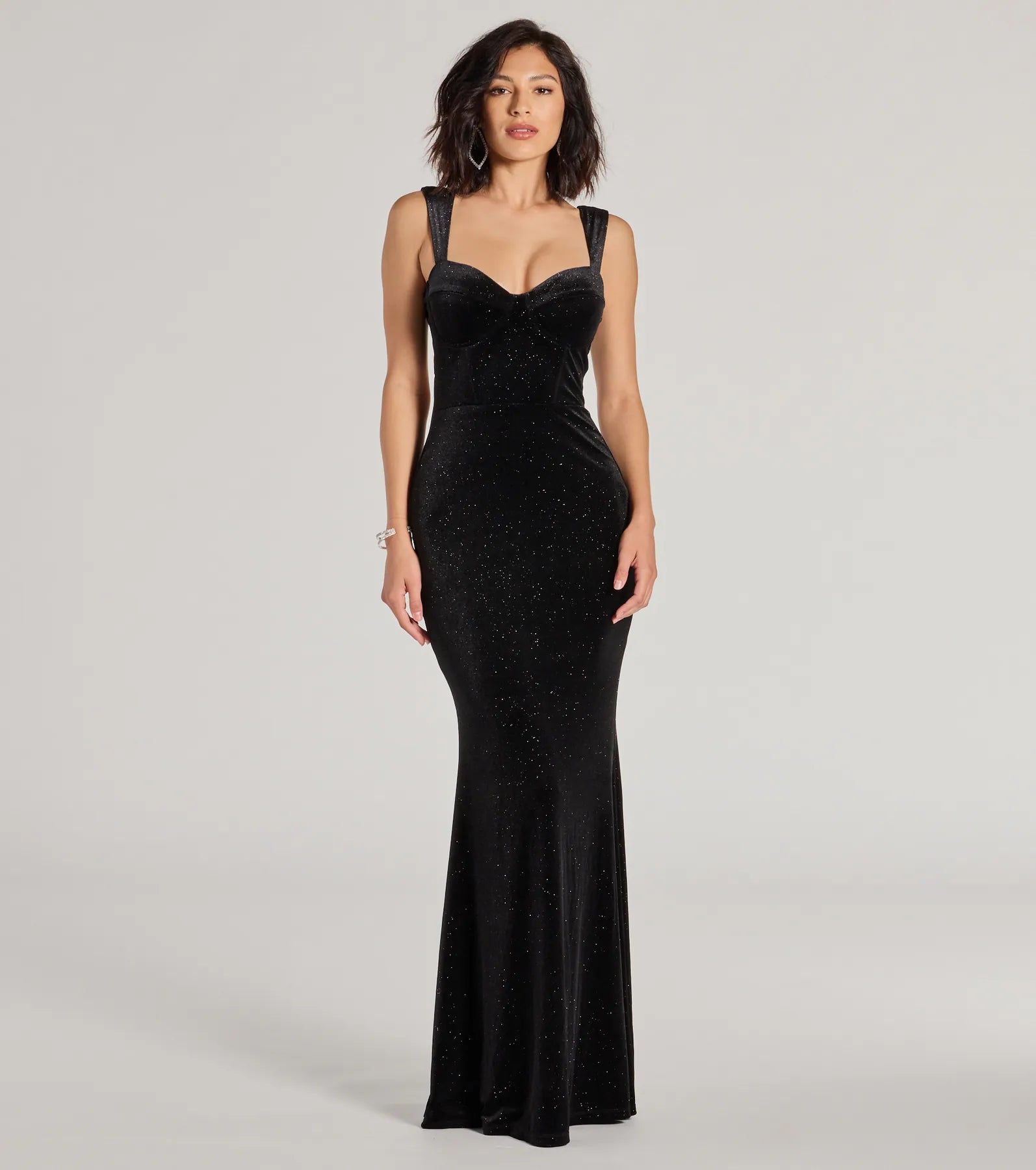 Shimmer in the elegant Veronica velvet formal dress at black tie parties and celebrations. The formal dress is designed with a structured sweetheart neckline and a striking mermaid floor-length silhouette. Pair with earrings and heels.