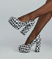 These platform pumps give you the perfect vibe check! They feature a closed almond toe. sides. and ankle. a chunky block heel. and a retro checkered pattern. Complete the look with a trendy mini handbag for a concert!
