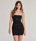 You'll be in the mood for fun with this mesh mini dress on a night out! With a cowl neckline and spaghetti straps. this dress offers a seductive yet fun look. The lace-up back and ruched bodycon fit add a touch of sexiness. while the mini-length hem keeps it flirty. Complete the look in platform heels.