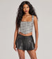 Step out this Halloween as a sultry villainous jokester in this checkered diamond corset top! Designed with smooth faux leather. it features hidden front hook-eye closures. a chic satin lace-up back design. and an angled cropped hem with a snatched form-hugging fit. Complete your costume with the mini skort. fishnet tights. and booties.
