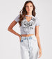 Play up an edgy style with this graphic crop tee perf pairing with your favorite denim! It features short sleeves. a cutout V-neck. a front graphic design with a script that reads. "Vintage Iron/High Performance". and a flirty knotted crop hem. Complete the look in best-selling jeans.