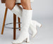 Walk it out in style with boots that elevate your outfit! The boots feature a knee-high length. a square toe. an inner zipper closure. and a block heel. The boots are composed of a faux leather material. Complete look with a sweater and mini skirt.