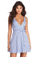 Step out and line it out in stripes! This pretty light blue dress features a plunging V neckline. tank-like straps. a cinching tie waist accent and a flaring skater skirt. The all over striped design is all you need for the perfect spring time look! Dress is composed of a linen fabric with a knit lining.