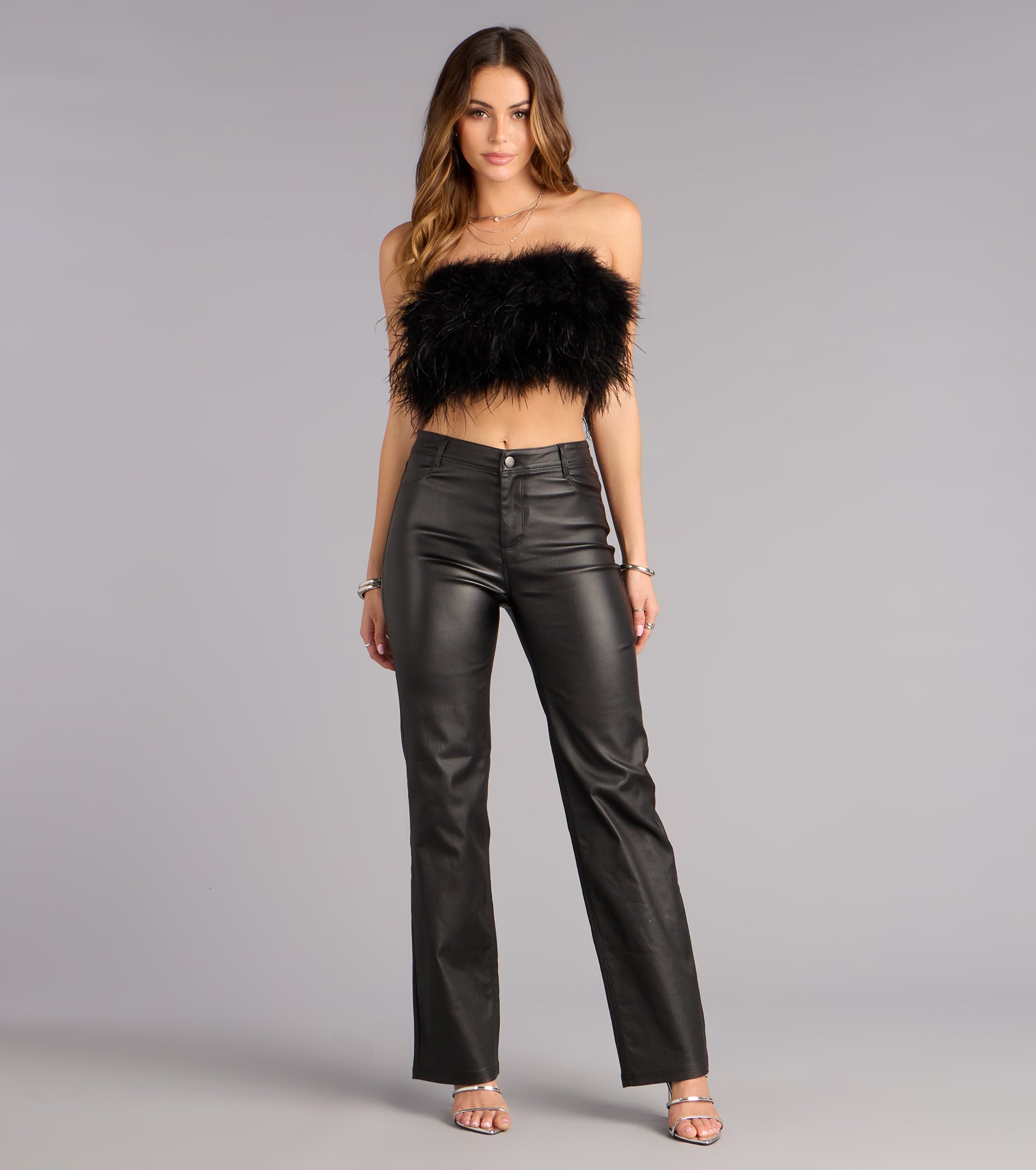 In these faux leather pants. you'll be walking the walk of cool-effortless style! They feature a flattering high-rise waist and straight-leg silhouette on coated faux leather fabric that offers a sleek look for workwear or everyday 'fits. Complete the look in a smooth bodysuit and block heels.