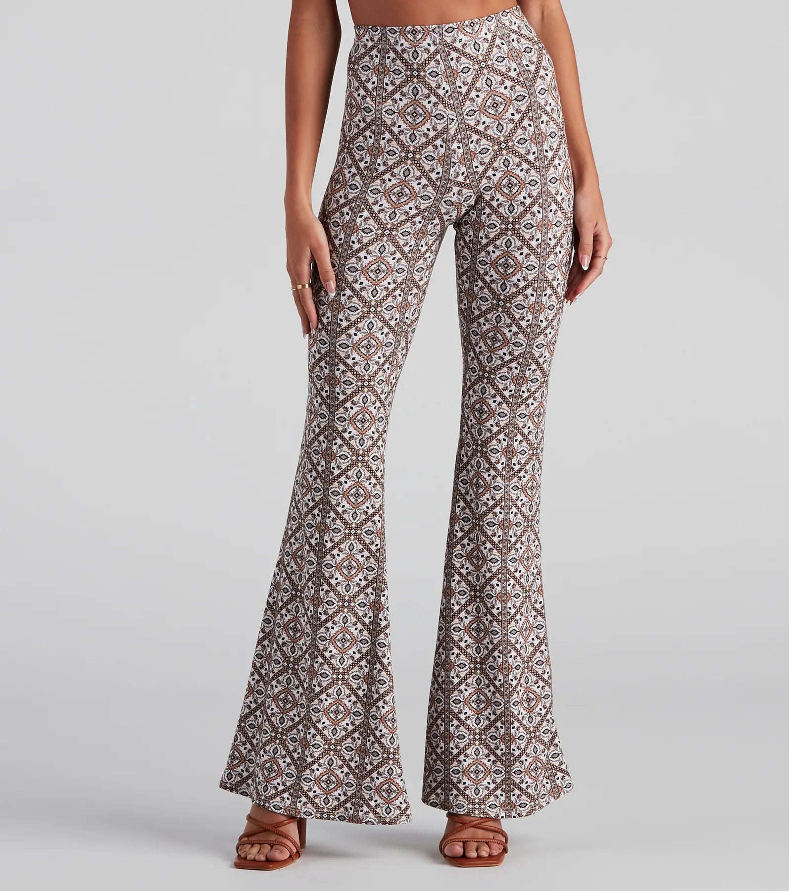 Look like you're off to a weekend in the desert in these trendy flare pants! They feature a high-rise waist. a form-hugging fit throughout the leg. a flared hem. and an all-over bohemian-inspired diamond print pattern. The brushed knit fabric offers plenty of stretch. Complete the look with the matching crop top.
