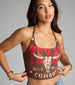 This graphic halter crop brings major wild west vibes with hoop inserts. an open back. and a flirty cropped hem that's ready for the next rodeo—or the concert!