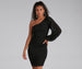Create a head-turning look with a mini dress that makes a stunning entrance! The dress features a one-shoulder neckline. a long sheer balloon sleeve. ruching. and a mini length silhouette. The dress is composed of a lined lightweight woven fabric that offers a form hugging fit with minimal stretch. Complete look with stiletto heels and a faux leather clutch.Â