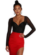 What's your secret for being sweet and sexy? This black bodysuit features a plunging sweetheart neckline. a lace bustier bodice with padding and underwire. long fitted sleeves. a hidden back zipper closure. and a knit bottom with snap button closures. Bodysuit is composed of a sheer mesh fabric.Â