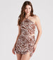 Show off a wild style in this trendy zebra print crop top! It features a sleeveless halter neckline with tie-back spaghetti straps. an angled cropped hem. and a form-hugging fit. Complete the look with the matching mini skirt and pair of clear heels.