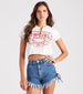 Show em' how it's done out west in this graphic crop tee at a country bar or festival! It features short sleeves. a crew neck with a slit accent and safety pins. a front graphic with a script that reads. "Cowgirls Rodeo/Wild West" and a raw-cut cropped hem on stretchy cotton fabric. Complete the look in eye-catching denim shorts.