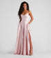 The Winslow is absolute perfection! Gracefully glide into any room in this satin formal gown showcasing a gorgeous lace-up back design that turns heads and a striking high slit for pretty and effortless movement on the dancefloor.