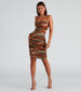 Girl. your taste is a work of art! Step out in a midi dress that features a gorge marble print. a sleeveless scoop neckline with bungee spaghetti straps. and a midi length hem with ruching throughout. The dress is composed of a lined mesh fabric that offers a form-hugging fit with a moderate stretch. Complete look with mules and a quilted crossbody.