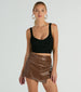 Babe. this faux leather mini skort is totally worth it! Featuring a sleek mid-rise waist. a front skirt overlay with a ruched seam. a bodycon silhouette. and shorts lining. Style with a best-selling corset top and heels to complete the look for a night out!Â