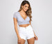Wrap yourself in a chic mesh top that makes a sheer impression. The top features a plunging wrap V-neckline. short sleeves. and a cropped hem. The top is composed of a sheer unlined mesh fabric that offers a moderate stretch. Complete look with the matching maxi skirt and sunnies.