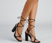 Wrap yourself in block heels that add that finishing touch to your outfit! The heels feature an open back. lace-up ties. an open square toe with a strap over the toe. and a block heel. The heels are composed of a faux leather material. Complete look with a mesh bodycon and rhinestone earrings.