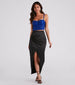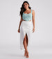 Get wrapped in chic vibes in this sleek satin maxi skirt! It features a high-rise waist with ruched detailing. a faux wrap-front design creating a high front slit. a maxi-length hem that hits right above the ankle. and a curve-hugging silhouette. Style with a cropped bustier and clear heels.