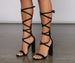 Wrap yourself with luxe heels that elevate your style The heels feature a wrap-around strap design. an open almond toe with a single strap over the toe. and a block heel. The heels are composed of a faux suede material. Complete look with a floral mini dress and handbag.