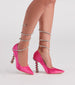 Get wrapped in gorgeous glamour with these chic and stunning rhinestone satin pumps! They feature a closed pointed toe with a square-shaped front. a closed back. a sleek stiletto heel. and a rhinestone-embellished spiral accent that starts at the heel and wraps around the leg. Style with a party dress.